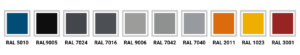 RAL 5010 STANDARD, RAL 9005, RAL 7024, RAL 7016, RAL 9006, RAL 7042, RAL 7040, RAL 2011, RAL 1023, RAL 3001
